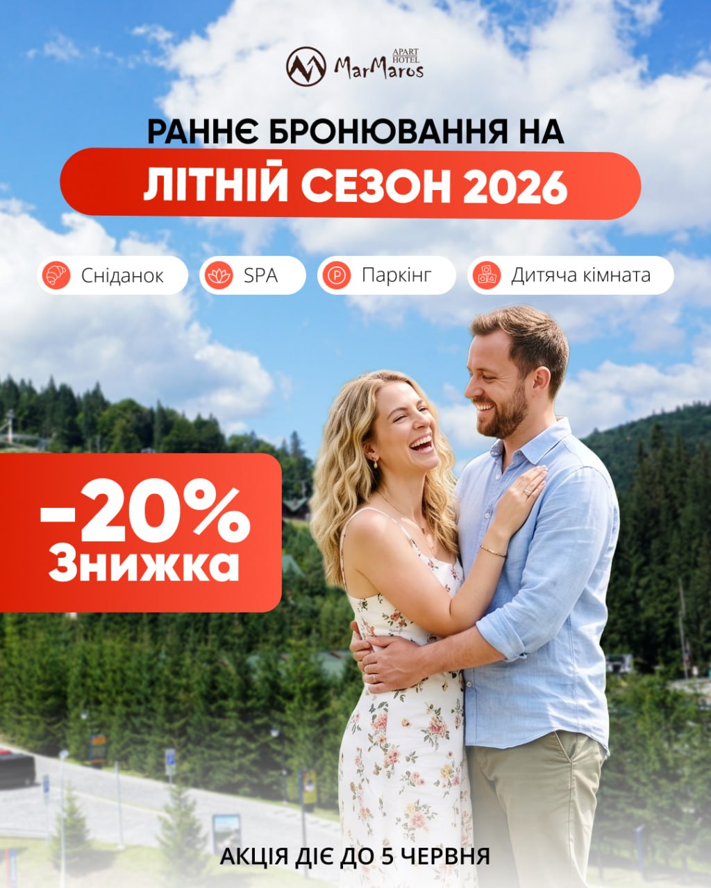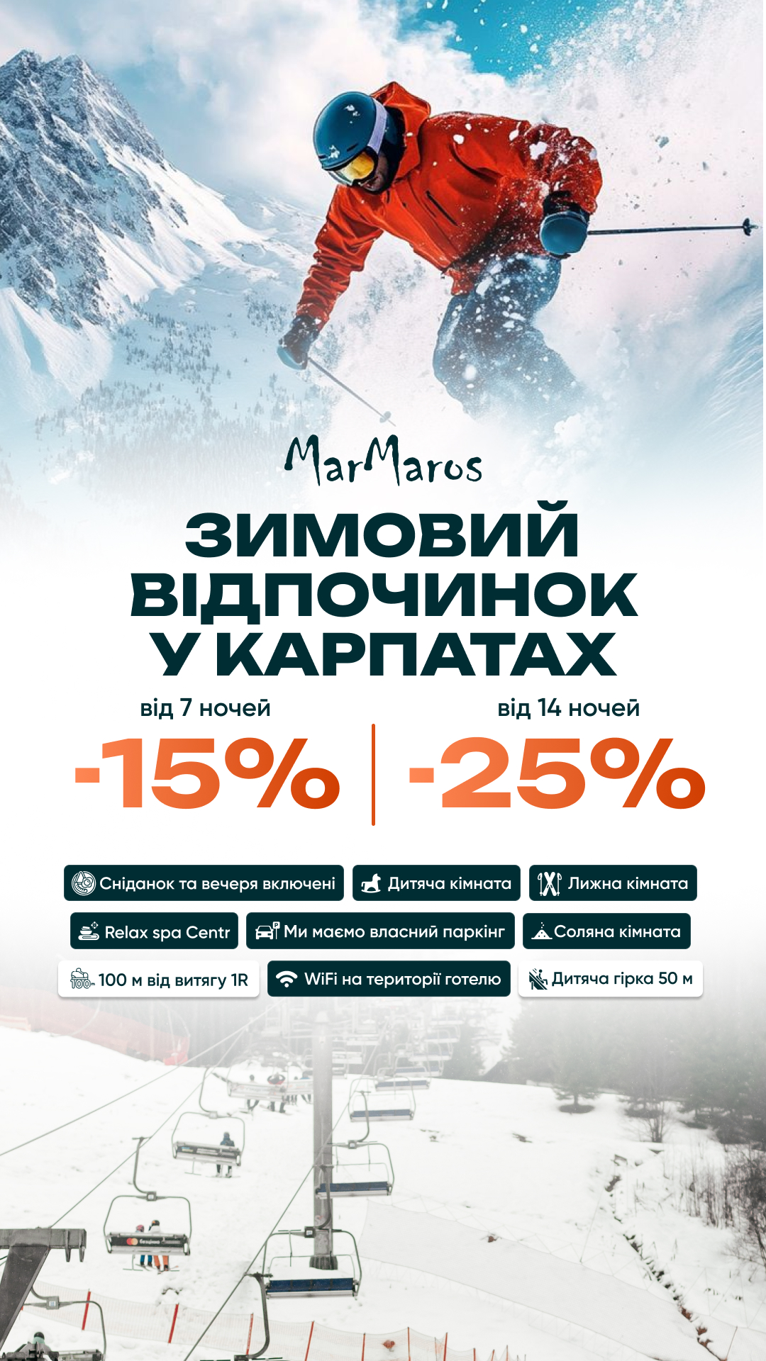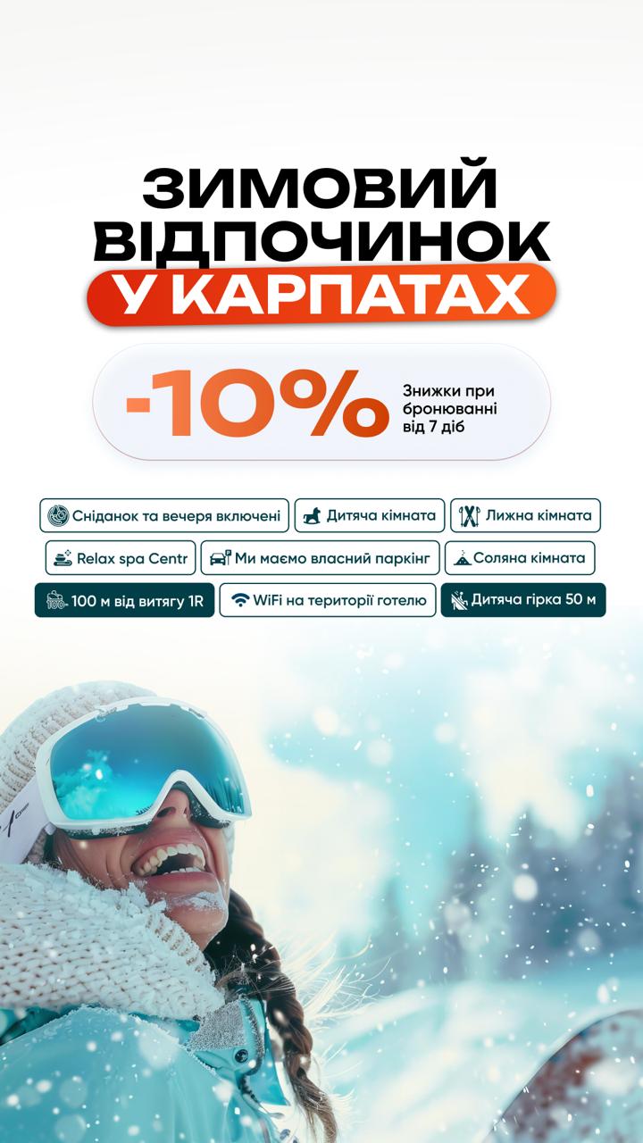Просторі номери з видом на гори, гостинний сервіс та ресторан – чудовий вибір для вашого відпочинку. Зупинившись тут, у вашому розпорядженні буде все, щоб ваше перебування у Буковелі стало максимально комфортним і незабутнім. У вашому користуванні безкоштовне паркомісце з можливістю заряджання електромобіля, панорамний ресторан, SPA та соляна кімната. З вікон усіх наших номерів відкривається вид на мальовничі Карпати.